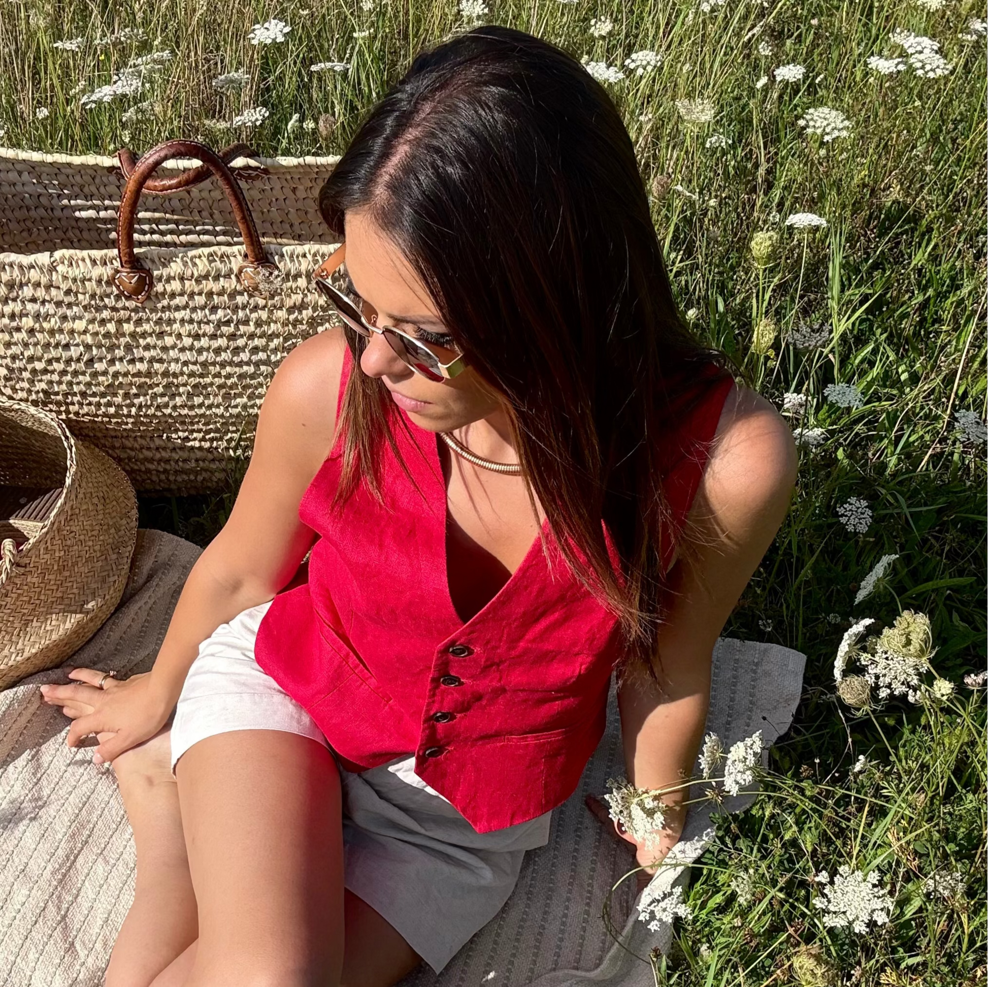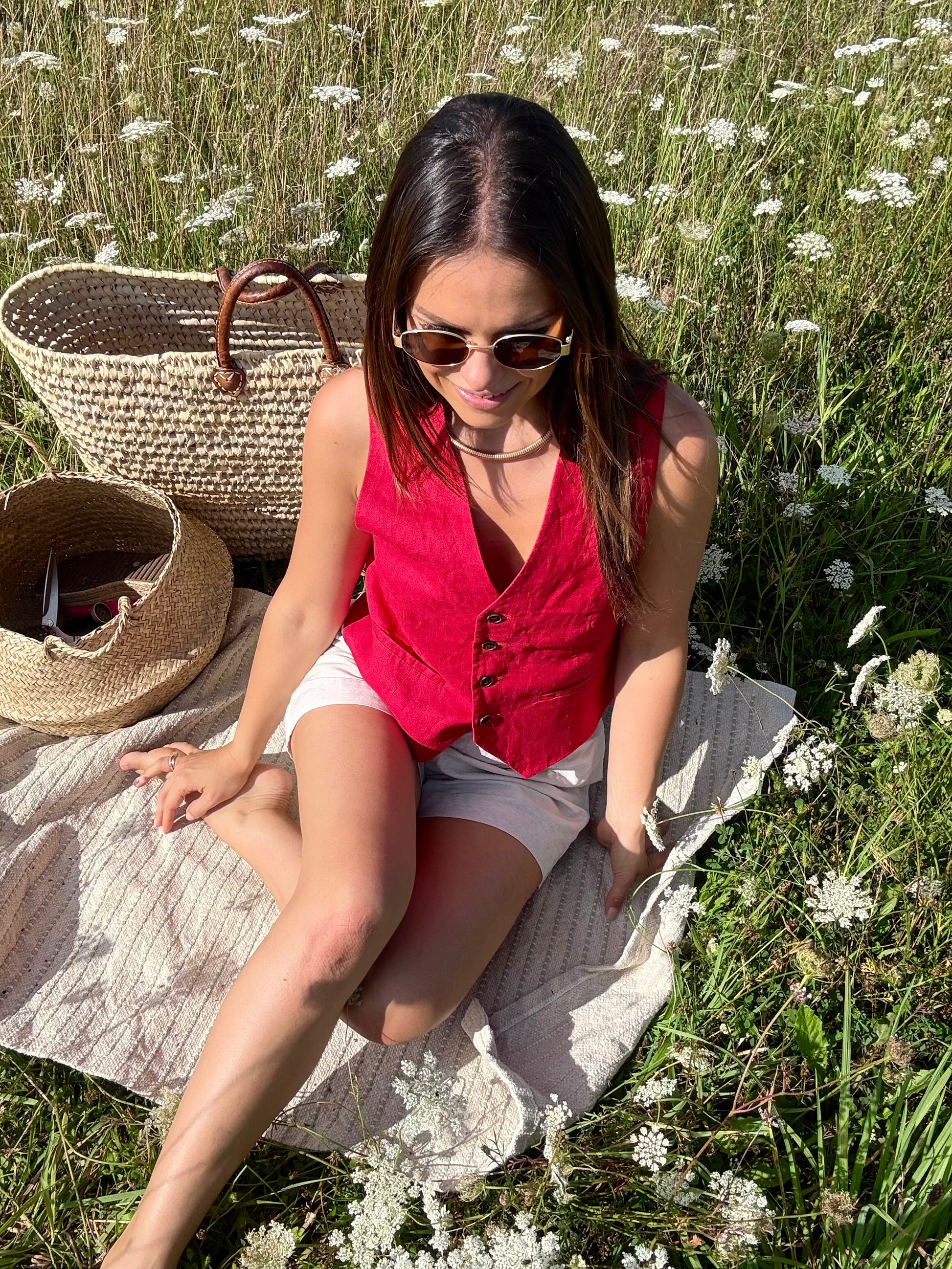 Le gilet Alba se dévoile dans une teinte rouge éclatante, parfaite pour dynamiser une silhouette. Confectionné en lin de qualité supérieure, il offre une allure structurée tout en légèreté. À porter en total look avec le short assorti ou dépareillé pour une touche plus casual. Un essentiel à revisiter au fil des saisons.