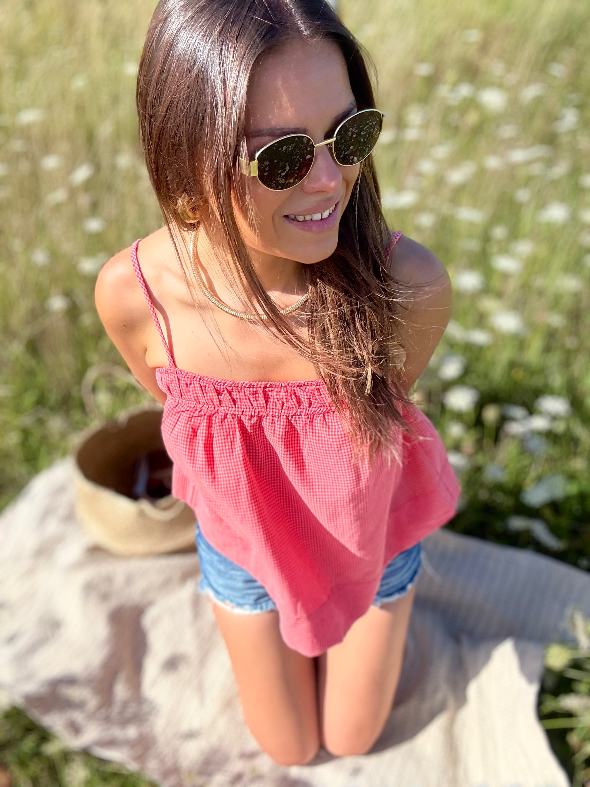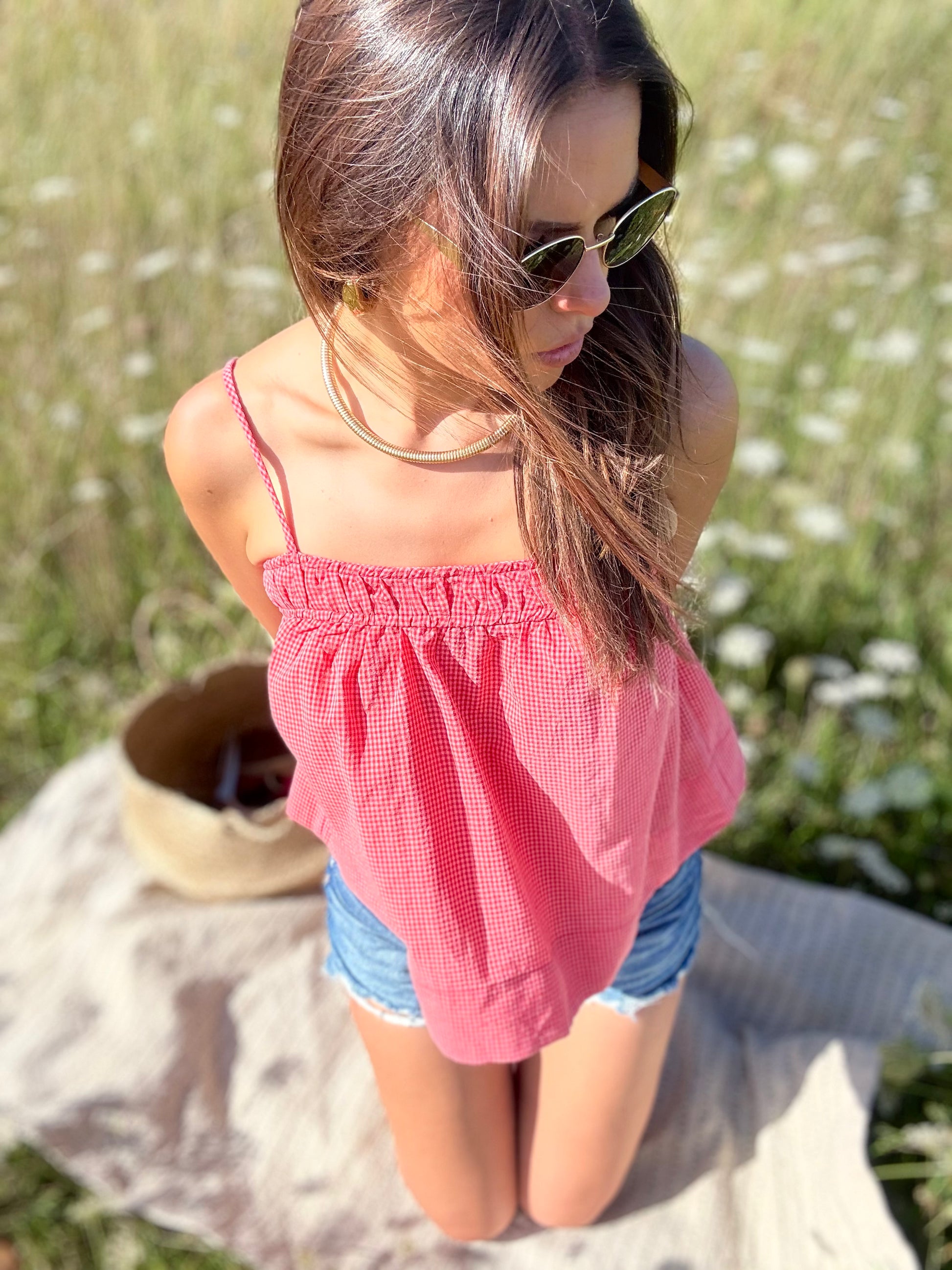 Le débardeur Romy dévoile une allure légère et estivale dans une version vichy rouge pleine de fraîcheur.Son encolure droite, ses fines bretelles ajustables et sa coupe fluide en font une pièce facile à porter, idéale pour les journées ensoleillées.