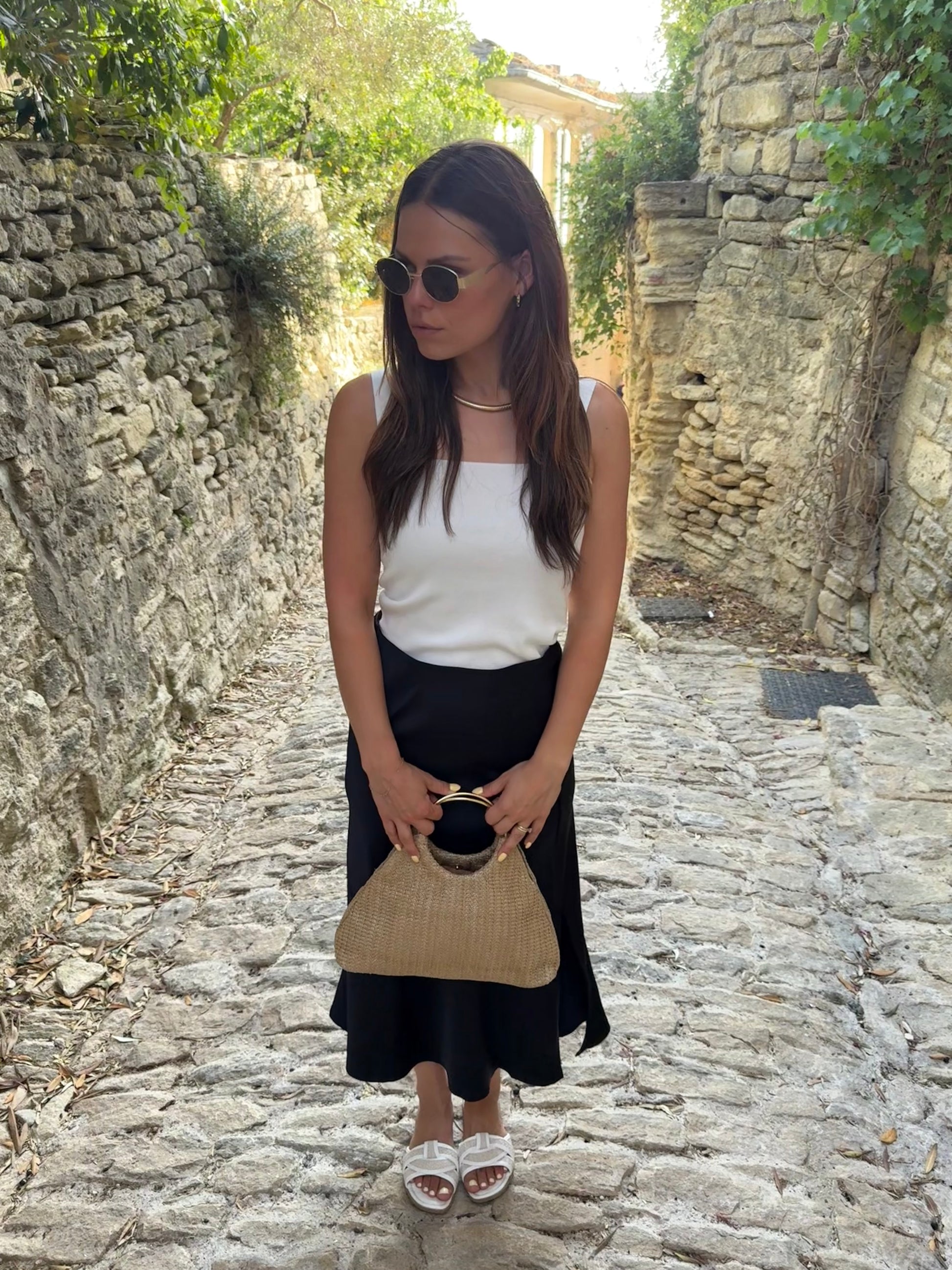 Conseil style : Associez la jupe June à notre caraco Lola pour un total look noir sophistiqué, ou jouez les contrastes avec le top blanc Ella pour une silhouette lumineuse.